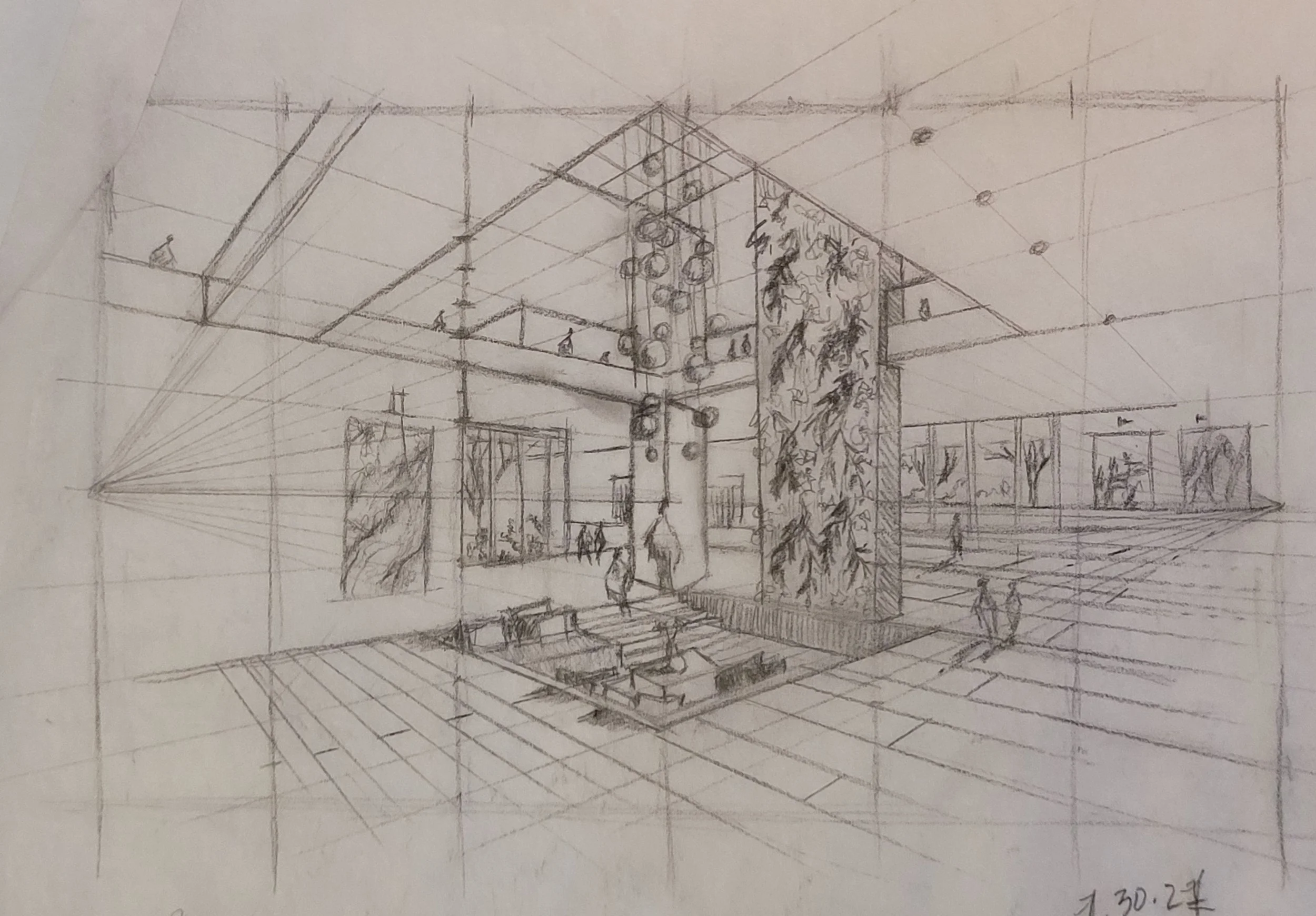 Application: Aligning a corridor with a central focal point in a gallery.Fenestration: Arrangement and design of openings such as windows and doors. See also: Materiality.