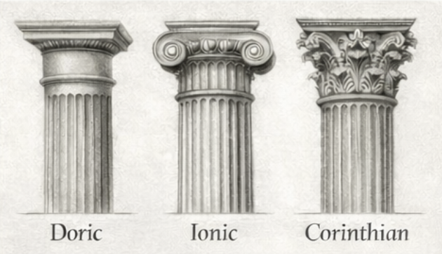 Application: Using Doric columns in a neoclassical building facade.Ionic Order: A classical column style distinguished by volutes on the capital.